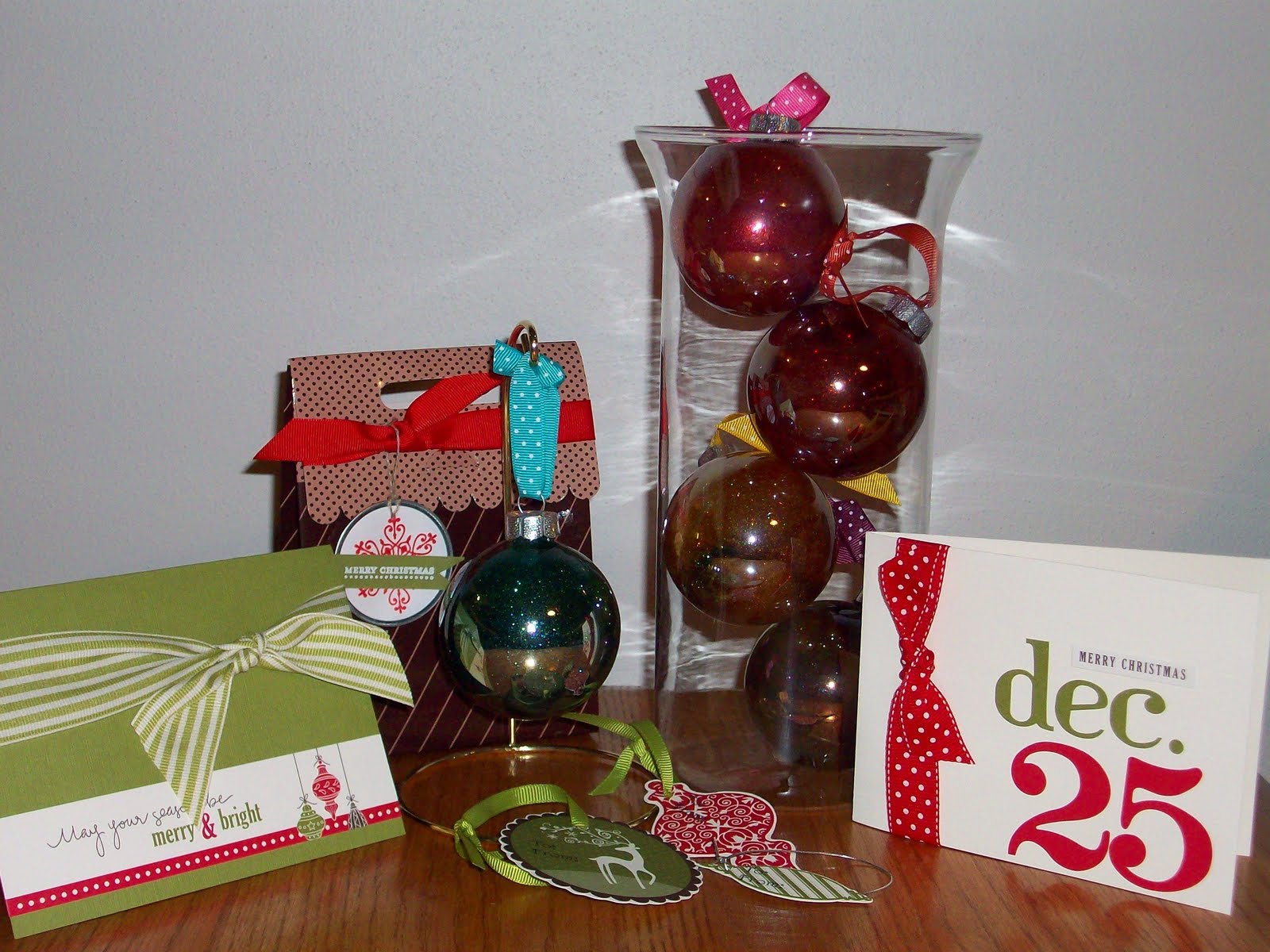 All you do is choose the color reinker of your choice, put a few drops into a clear glass ornament ball, roll it around to get full coverage on the glass. I than put it upside down inside a juice glass (with a napkin stuffed in the bottom) to drain any excess reinker. Funnel in your glitter and give it a good shake (umm make sure your finger is over the hole!) and tah dah! You have a beautiful sparkly ornament. I tied it off with a coordinating ribbon. These make awesome teacher and co-worker gifts!